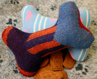Here’s a great project to re-purpose old sweaters and turn them into squeaky bones from CraftStylish. If you use a wool sweater, you should probably felt it first. If you don’t, then when you wash the finished toy, it may shrink into a MUCH smaller toy. If you use cotton or acrylic, it won’t felt. (Here are a few tutorials on felting, in case you need them: this one covers both hand & machine felting, here is a printable one on machine felting, and another on hand felting.)