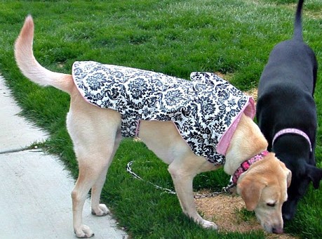 Cute coat!  Check out this great tutorial for a canine rain coat using oil cloth—the vinyl coated material used to make tablecloths, tote bags, etc.  Oil cloth is waterproof, easy to clean, and now comes great patterns.
