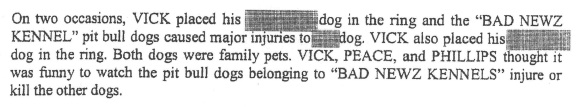 I don’t quite no what to say.  Michael Vick confirmed he is again a dog owner. I find it unreal he is allowed to have any pets.  He was banned from having dogs only while he was on probation.  I always want to be sure I know what I’m talking about, so I read over the Summary of Facts from the plea bargains of Michael Vick and his co-defendants, Purnell A. Peace, Quanis L. Phillips, and Tony Taylor.  That made for some pretty sickening reading.  Gut-wrenching.