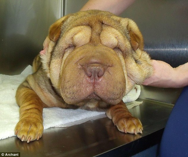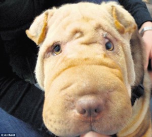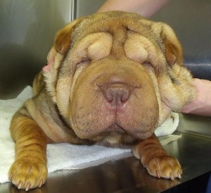 This is one of those cases where a dog has paid a huge price for exaggerated features humans have deemed desirable in a purebred dog.  Molly the Shar Pei was bred to have such a wrinkled face that no care was given to how this might affect her.  One of the results of selecting for wrinkles can be increased cases of entropion—an extremely painful condition where the eyelids are rolled into the eye and the fur scratches the dog’s cornea.  Molly’s entropion was so severe she had never actually been able to see and was at risk for going blind from the damage to her eyes.  Sickening.