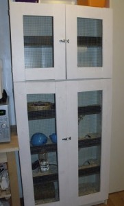 The rat condo made from Gorm shelving looks good and has room for some storage. Â I like that they added wheels to make it easier to move and clean around. Â It looks like they made the doors themselves, but that’s pretty easy. Â Home Depot and Lowes will cut your wood for you for free if you don’t have too many cuts to make. Â The “L” brackets at the corners are a good idea for strength and durability. Â You don’t want your condo doors to fall apart!