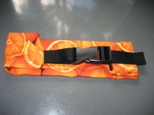 Cooling collar #2 is a collar in & of itself–it has a buckle–and is for a Lab-sized dog. Â It could easily be downsized for a smaller dog. Â This design uses either a strip of small ice packs or regular ice for cooling. Â I like that it has a buckle—seems more secure. Â This cooling collar is also reusable. Â (Like with anything, you want to make sure your dog isn’t able somehow chew on the collar or another dog’s cooling collar.)