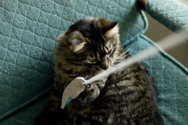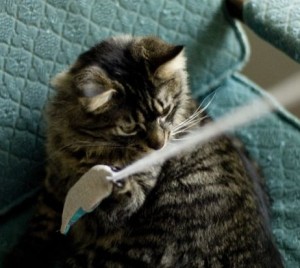 Make your own feather spinner cat toy similar to the Da Bird cat toy. Â The tutorial shows you what to do. Â You can make it as simple or elaborate as you like. Â Be sure to pay special attention to the instructions in Step #5 on the placement of the larger feathers to insure the toy spins.